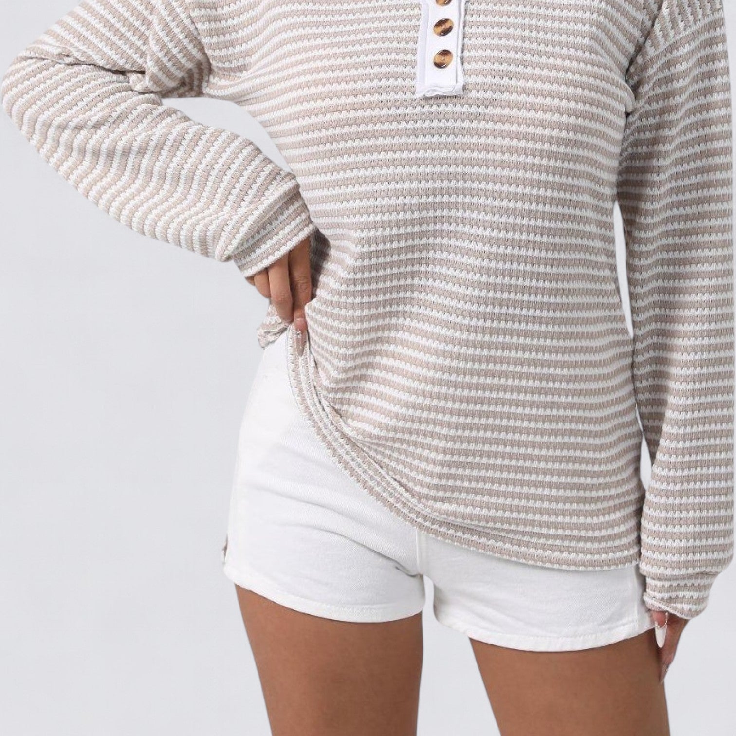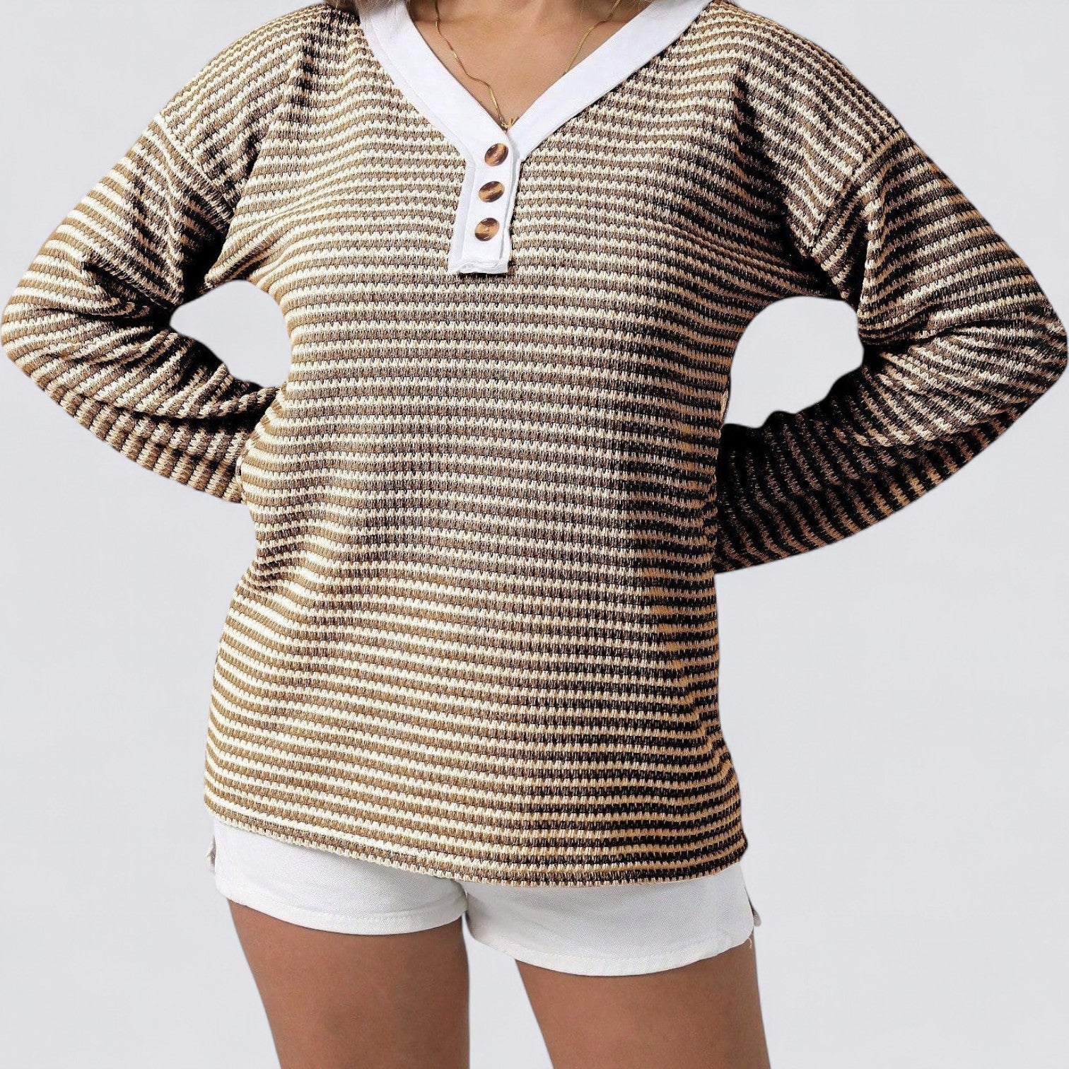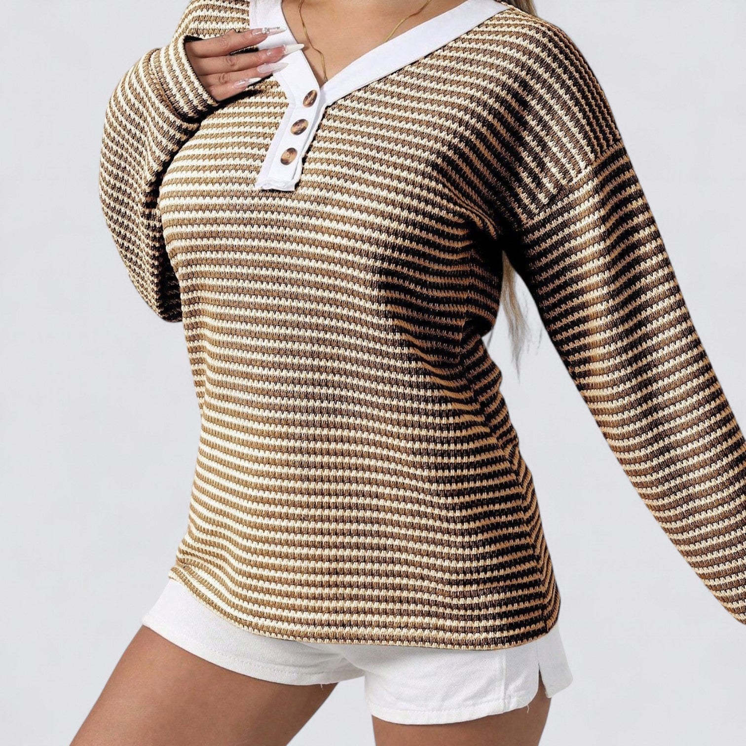 Unesi dašak šarma u svoju jesensku garderobu uz Pletenu majicu Ema. Elegantni V-izrez, dekorativni gumbi i kombinacija boja u blok uzorku stvaraju svjež, ali bezvremenski izgled. Mekana i udobna, savršena je za svakodnevne trenutke – od jutarnje kave do opuštenih vikend šetnji.