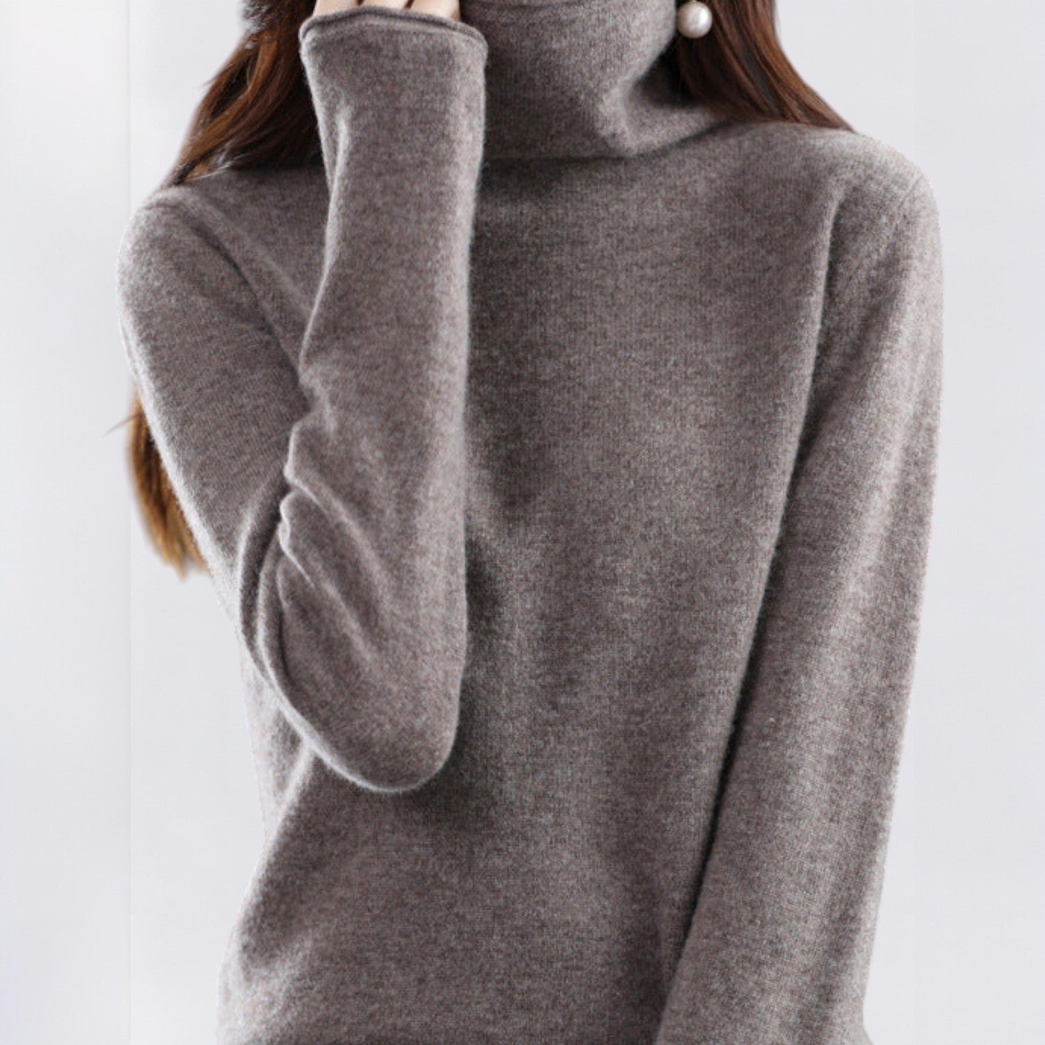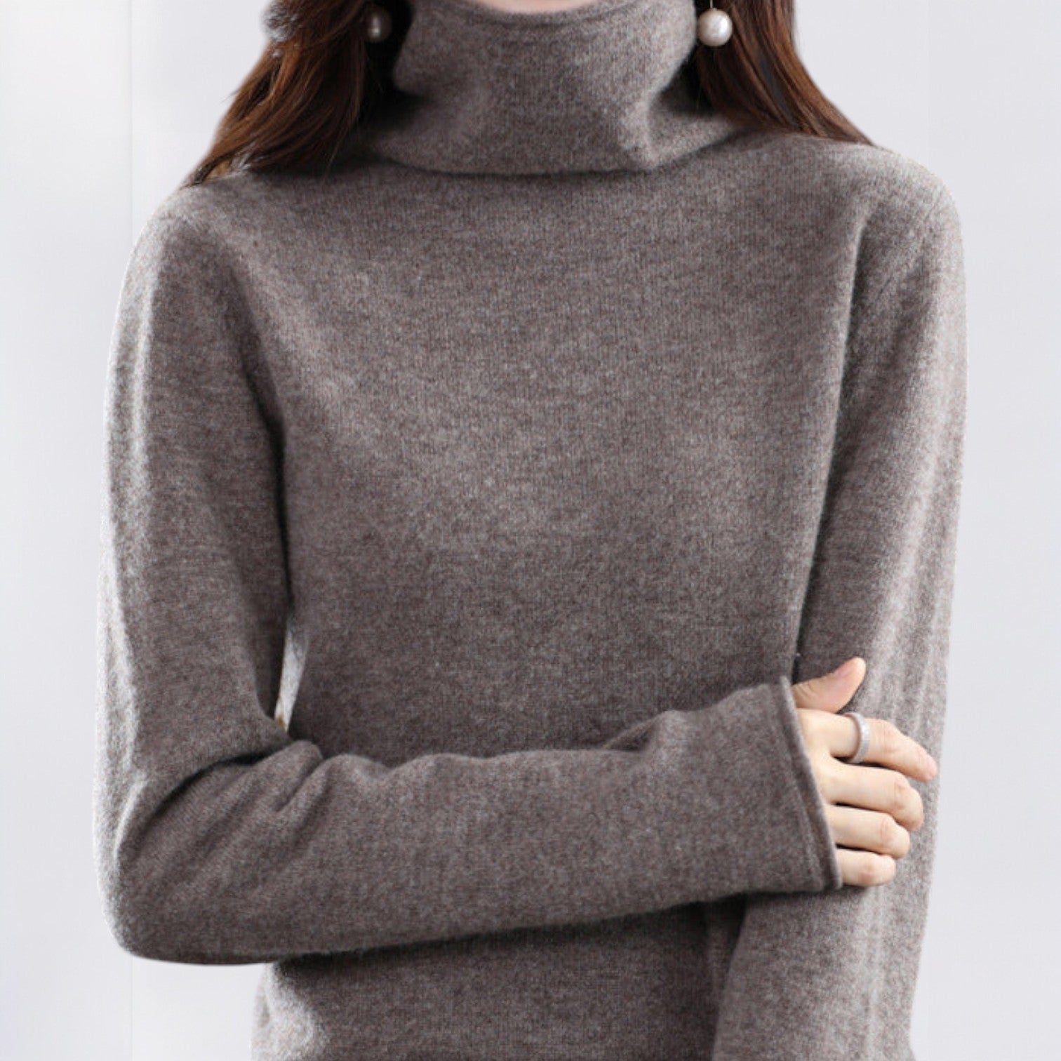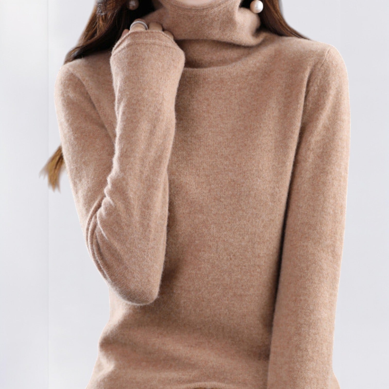 Olivia | Pleteni vuneni dolčevita džemper luksuzan je komad koji savršeno spaja toplinu i stil. Izrađen od bogate mješavine vune, ovaj srednje debeli, ležerno krojeni džemper ističe se elegantnim slojevitim ovratnikom i udobnim pristajanjem — savršen za kombiniranje u prohladnim danima.