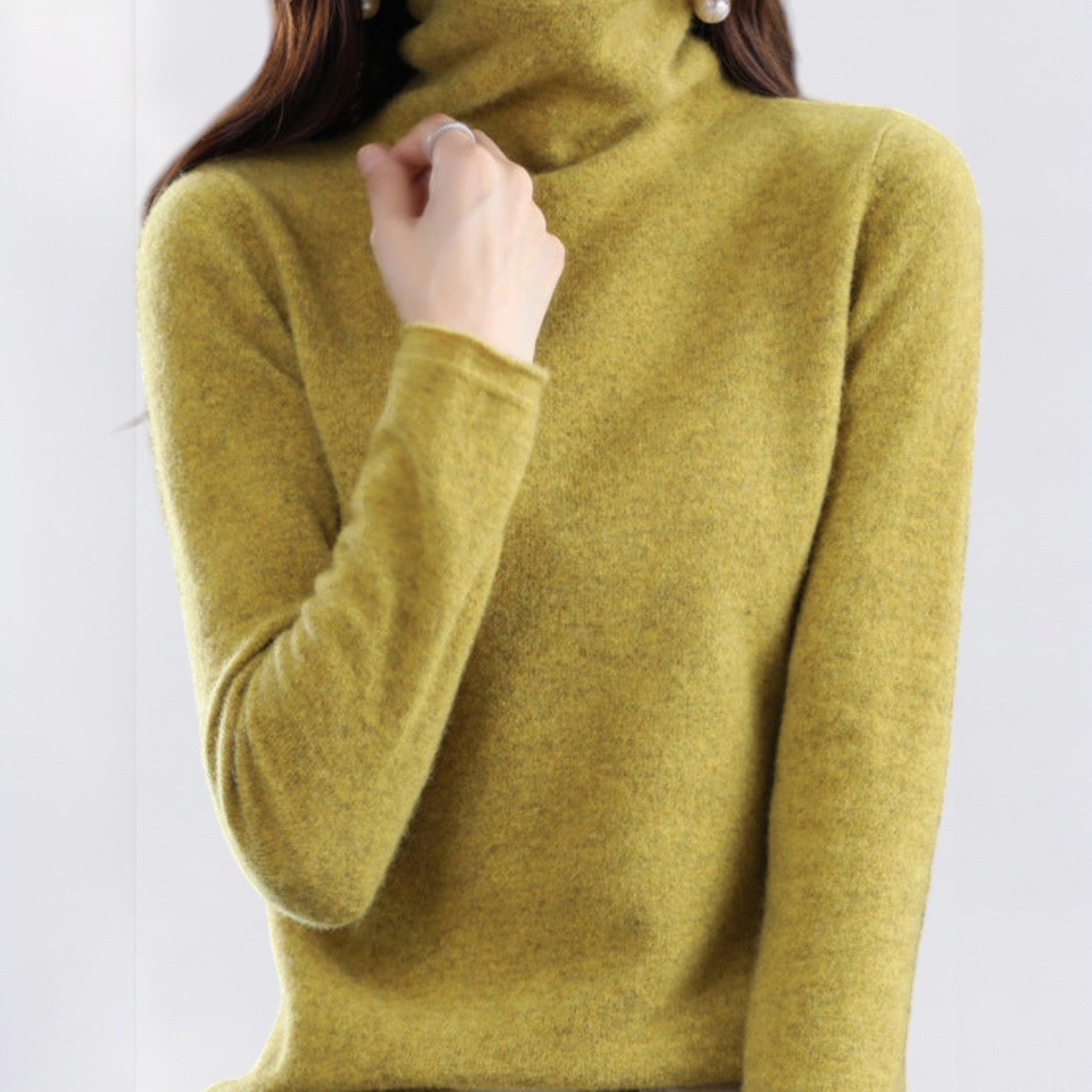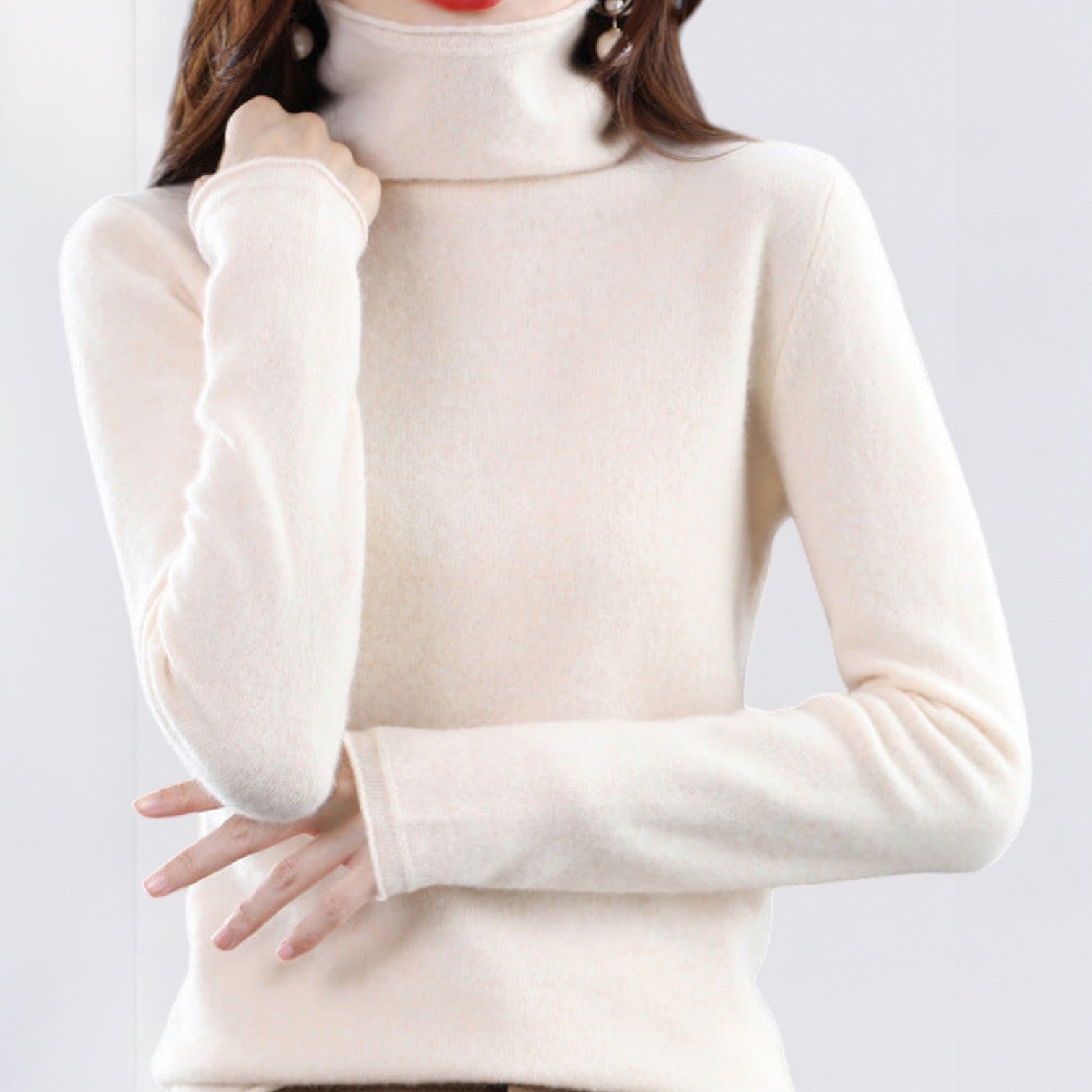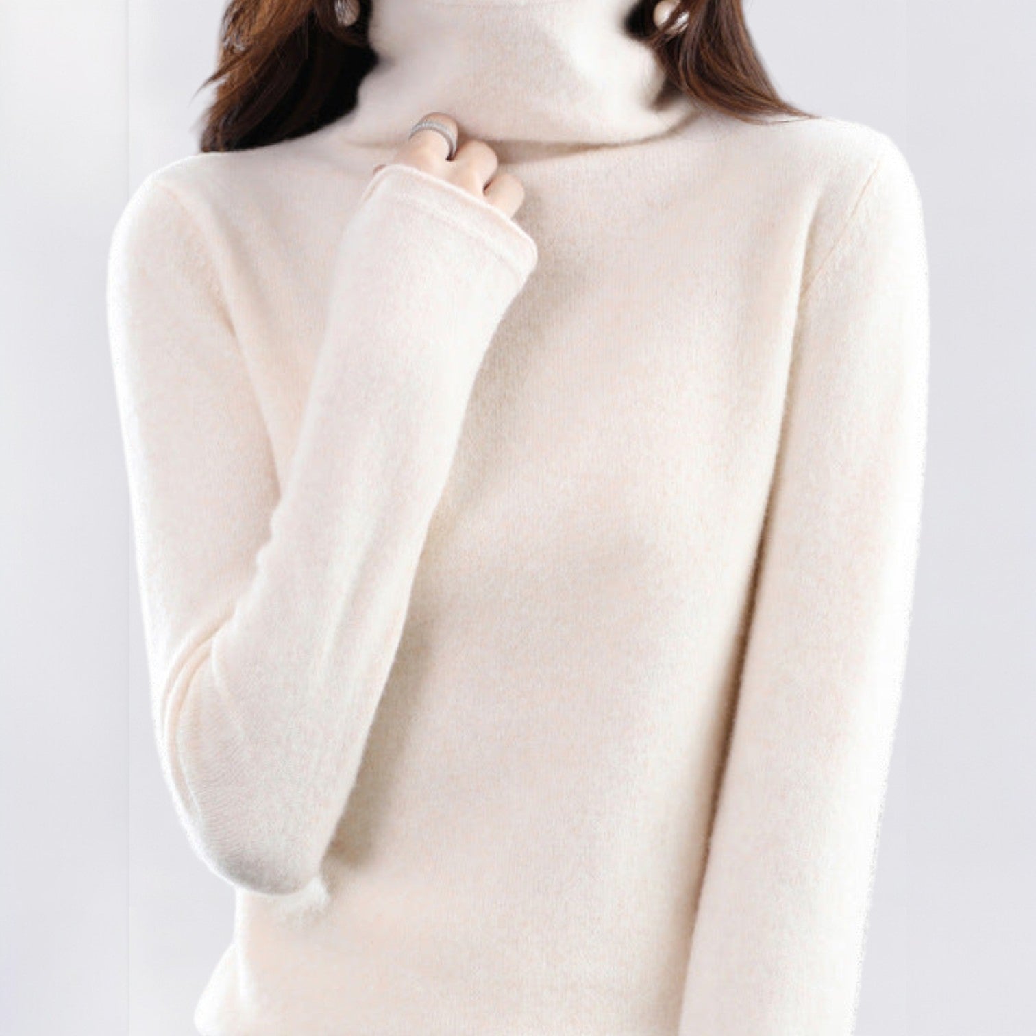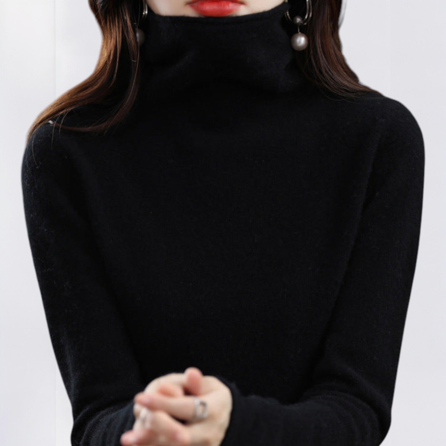 Olivia | Pleteni vuneni dolčevita džemper luksuzan je komad koji savršeno spaja toplinu i stil. Izrađen od bogate mješavine vune, ovaj srednje debeli, ležerno krojeni džemper ističe se elegantnim slojevitim ovratnikom i udobnim pristajanjem — savršen za kombiniranje u prohladnim danima.