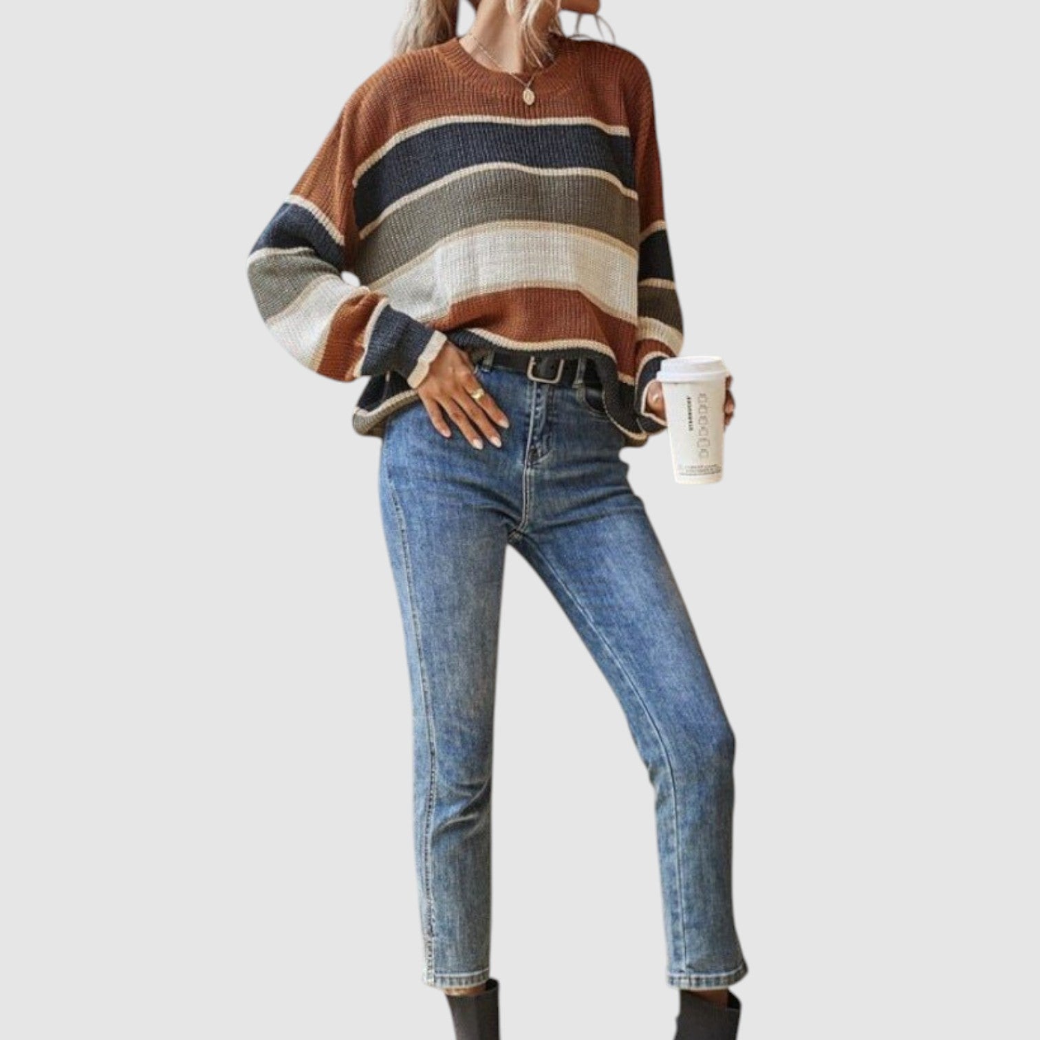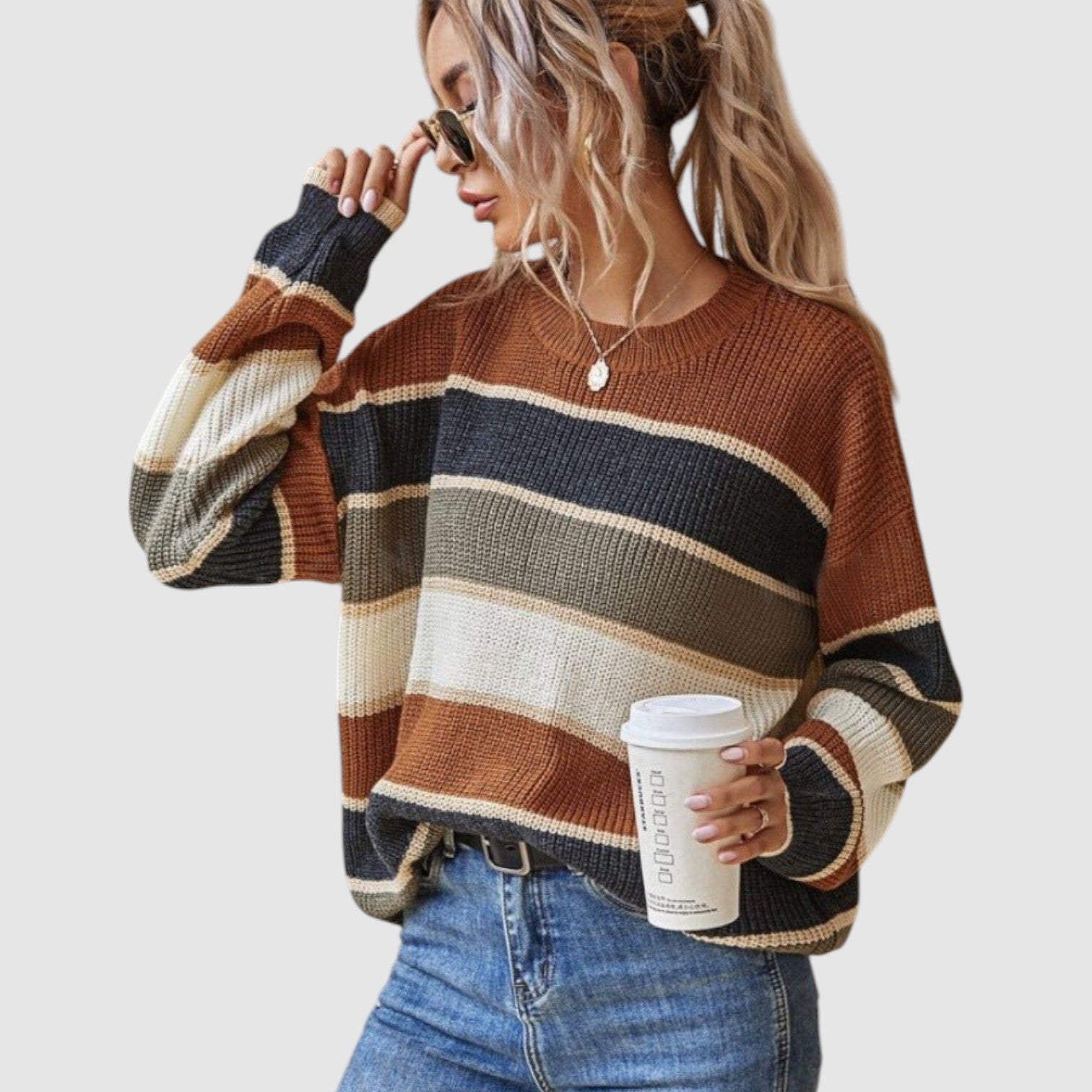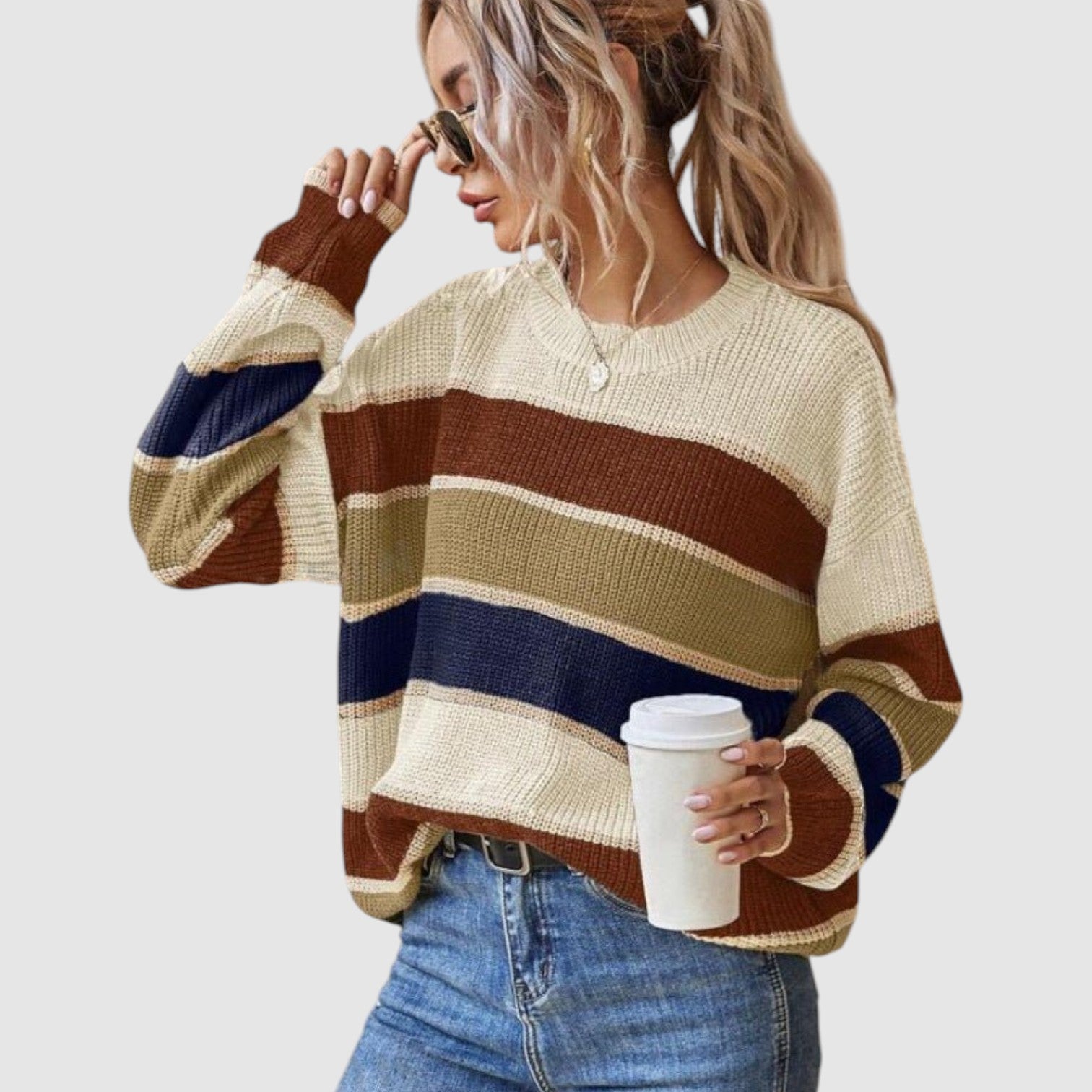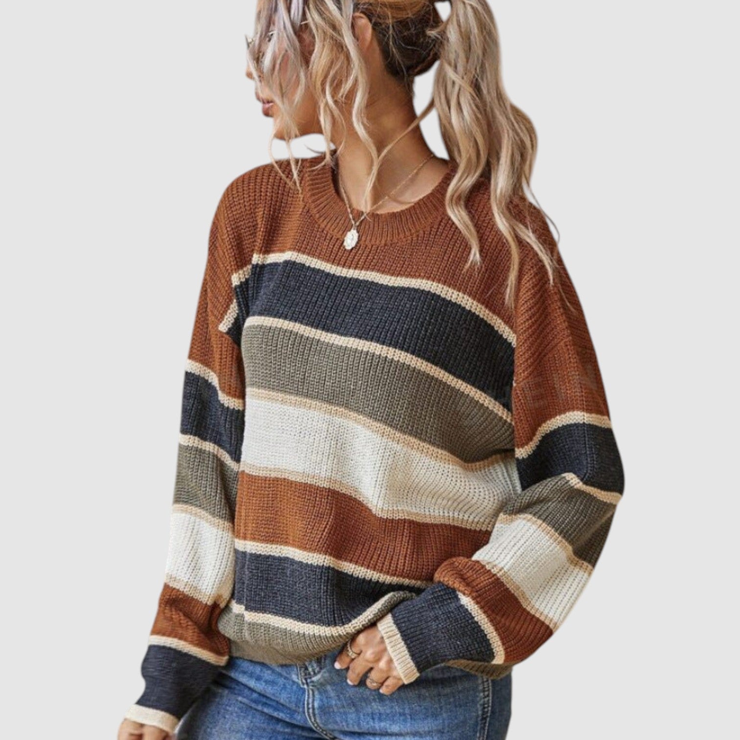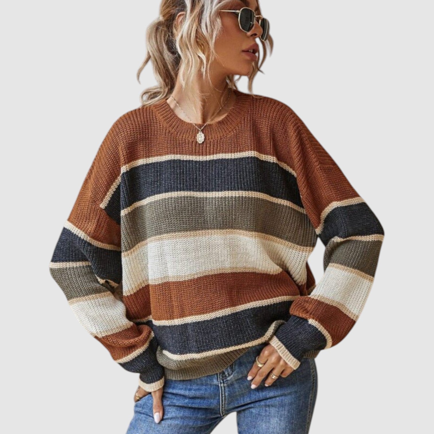 Paola | Prugasti Udobni Džemper je savršen spoj stila i udobnosti. Sa svojim mekšim, pletenim materijalom i sofisticiranim prugastim dizajnom, ovaj džemper pruža savršen balans između ležernog izgleda i luksuzne udobnosti. Idealno za svakodnevne aktivnosti, od jutarnje kave do opuštajućeg popodneva, njegova kombinacija zemljanih tonova i elegantnih pruga čini ga savršenim komadom za svaku garderobu.
