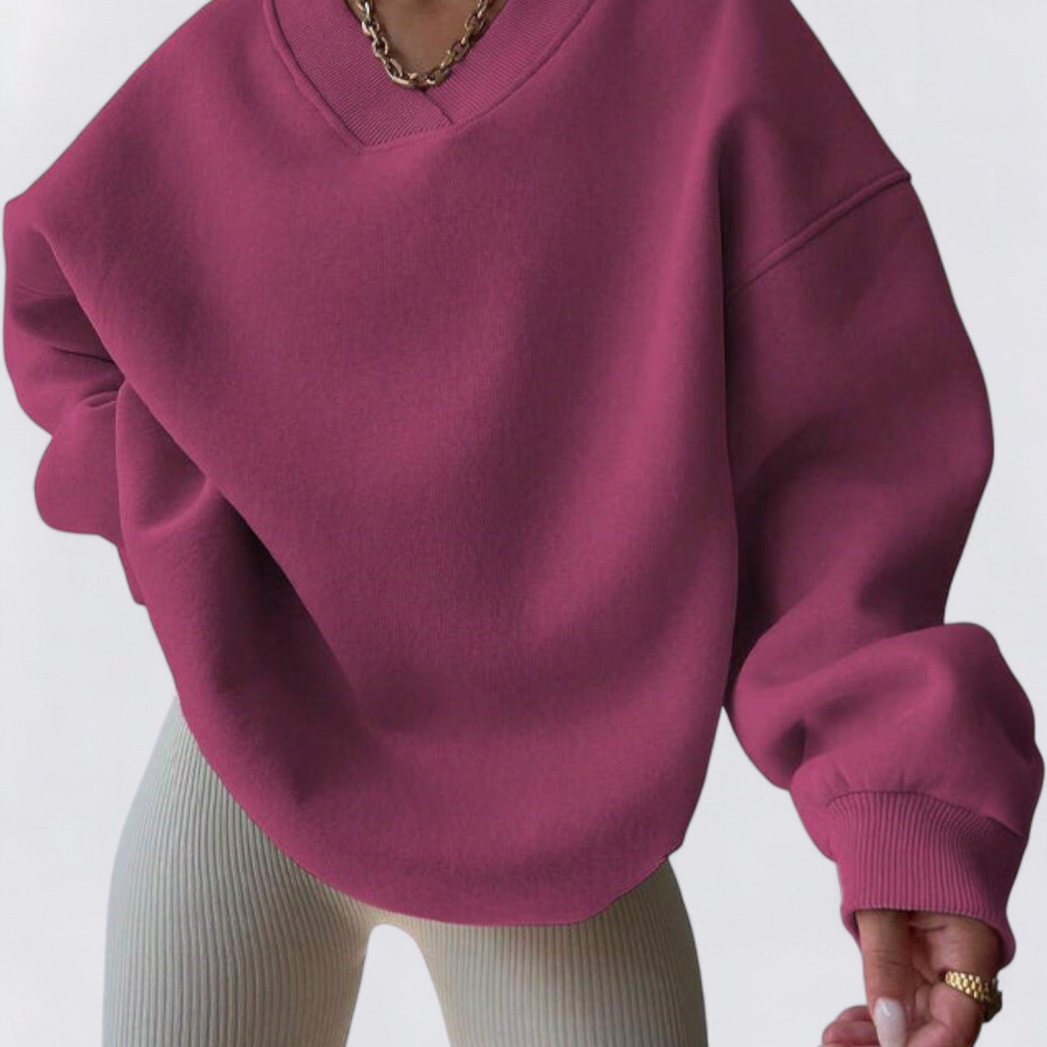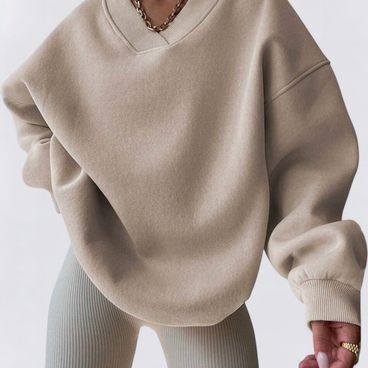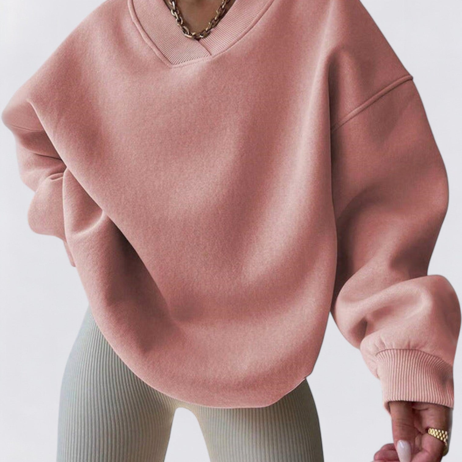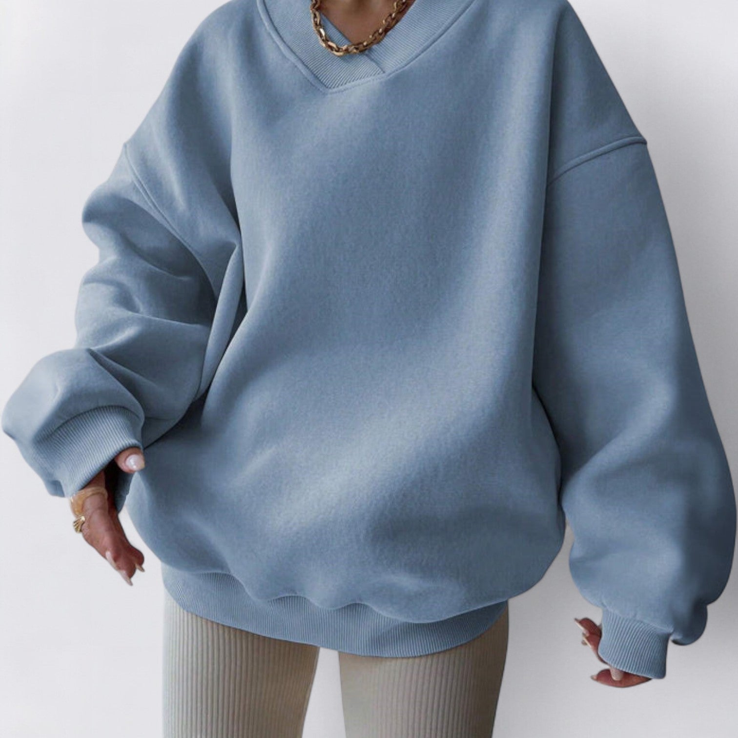 U nježnim pastelnim tonovima, ova majica spaja suptilnu eleganciju i ugodnu toplinu. Njezin ležeran, oversized kroj omogućuje prirodan pad i slobodu pokreta, dok rebrasti rubovi i moderan V-izrez dodaju dašak profinjenosti.