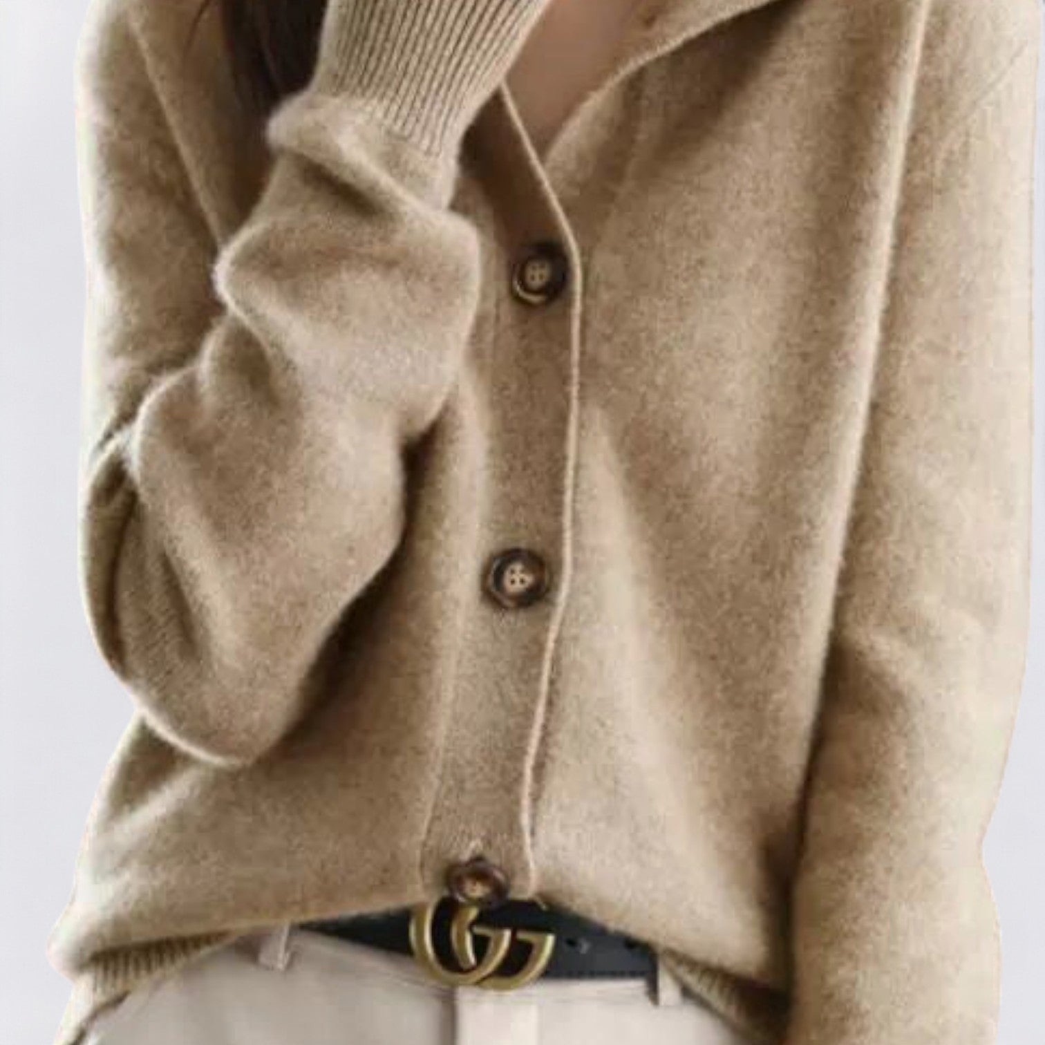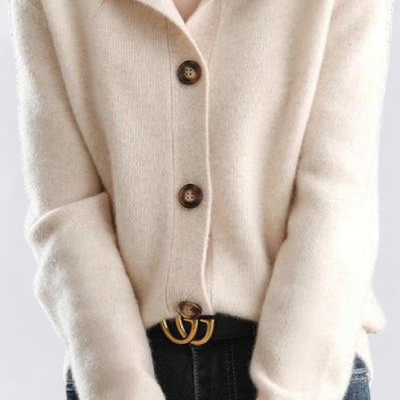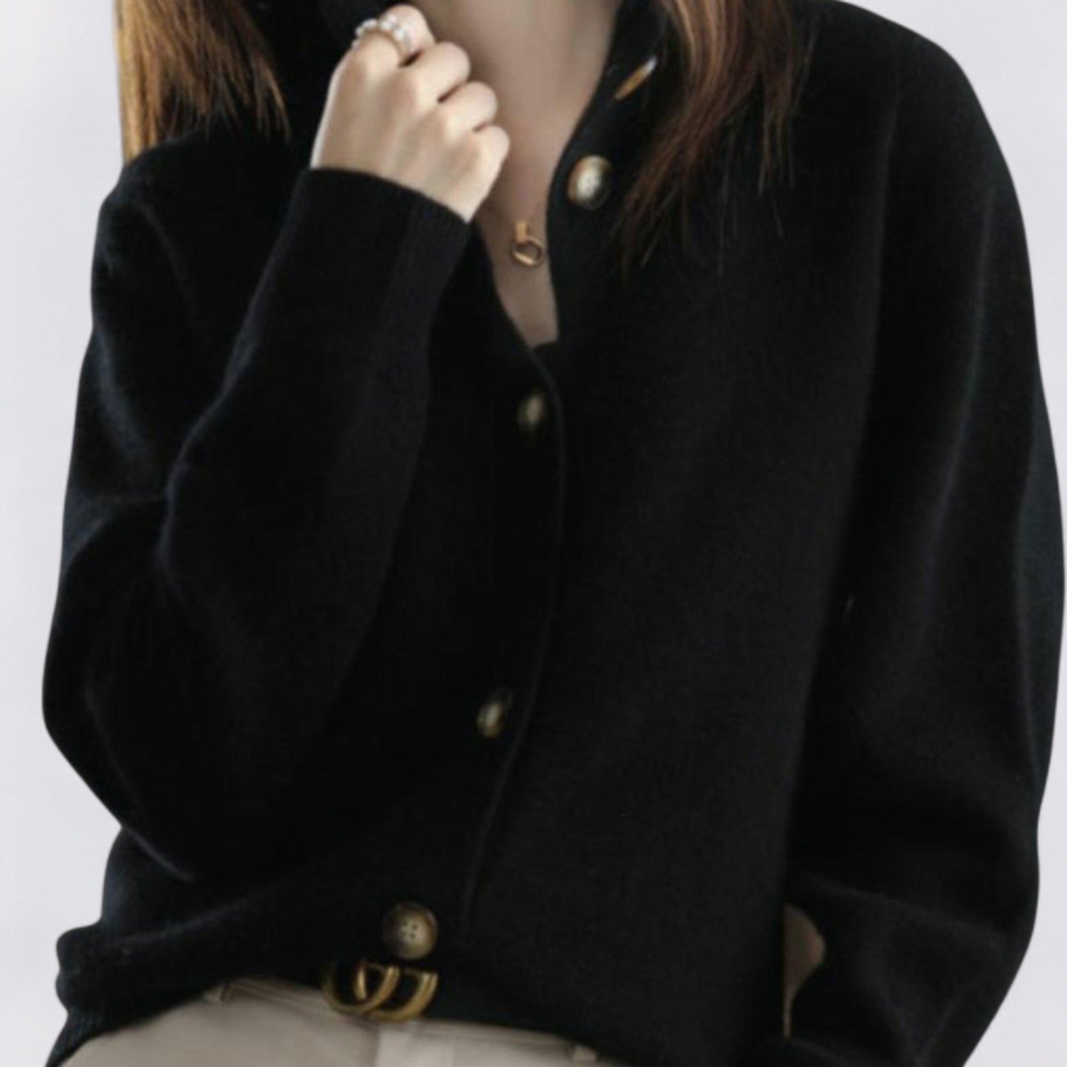 Iva kardigan odiše bezvremenskom privlačnošću, a u kombinaciji s vrhunskom izradom predstavlja vrijedan dodatak svakoj garderobi. Ukrašen elegantnim gumbima i visokim ovratnikom, ovaj kardigan dodaje profinjenu notu svakom outfitu.