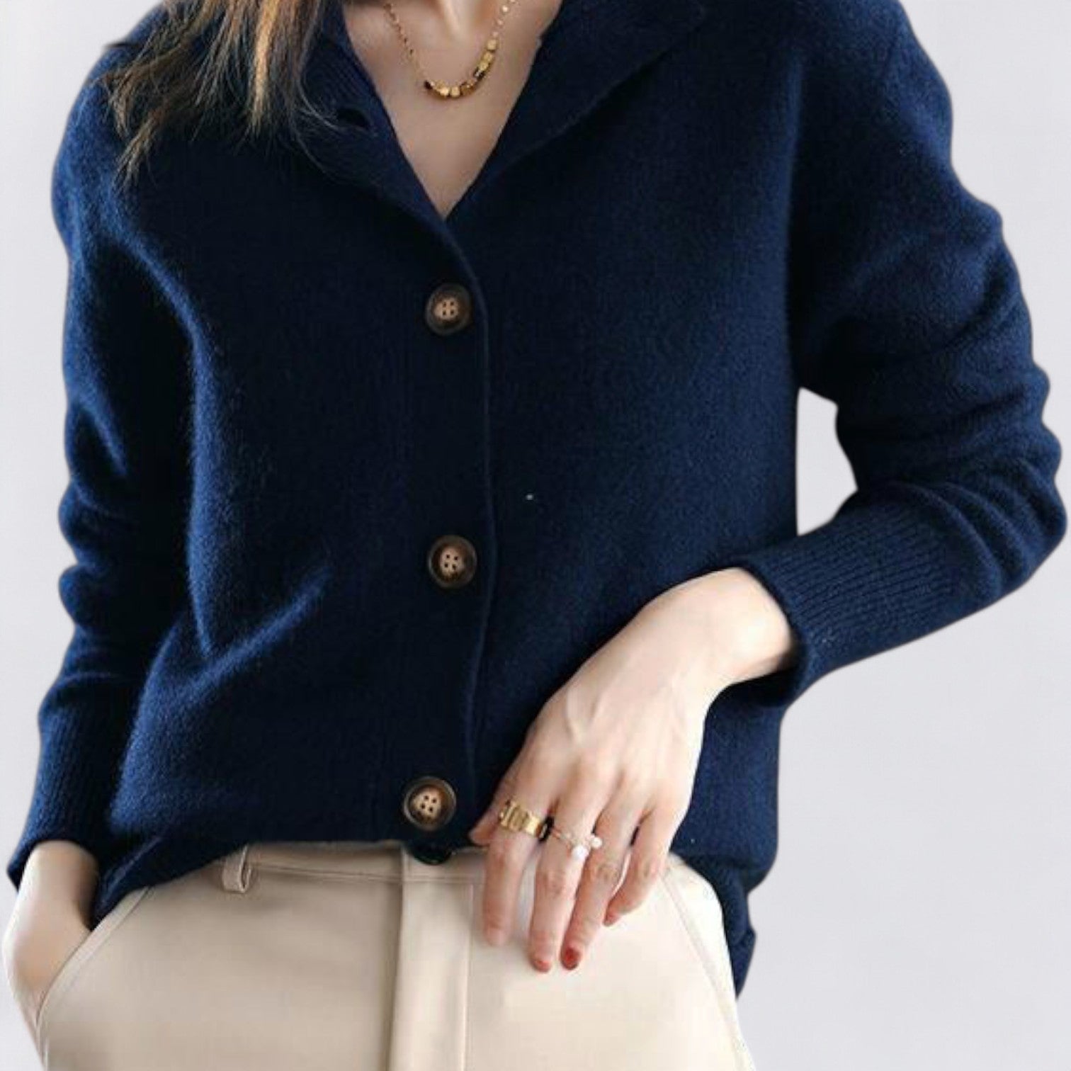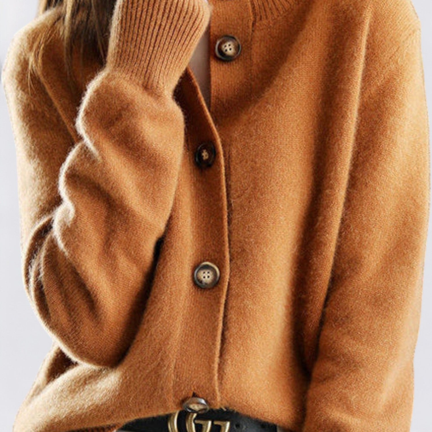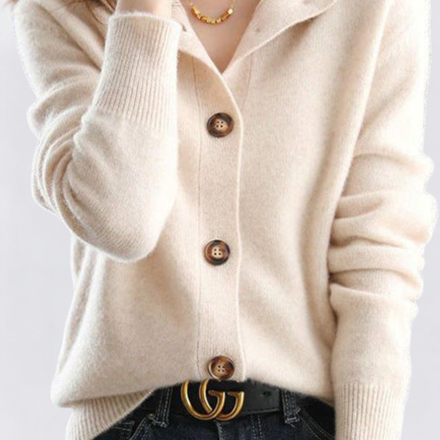 Iva kardigan odiše bezvremenskom privlačnošću, a u kombinaciji s vrhunskom izradom predstavlja vrijedan dodatak svakoj garderobi. Ukrašen elegantnim gumbima i visokim ovratnikom, ovaj kardigan dodaje profinjenu notu svakom outfitu.