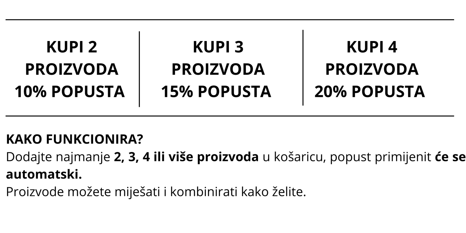 KUPI 2 I DOBIJ 10% POPUSTA • KUPITE 3 I OSTVARITE 15% POPUSTA • KUPI 4 I DOBIJ 20% POPUSTA •