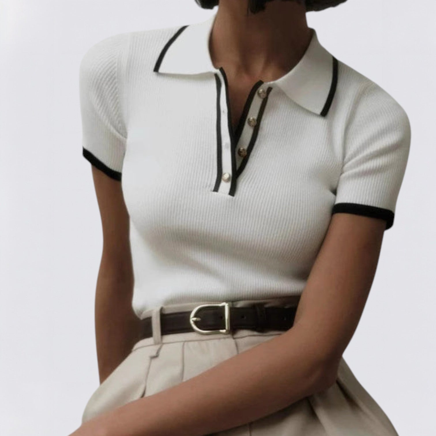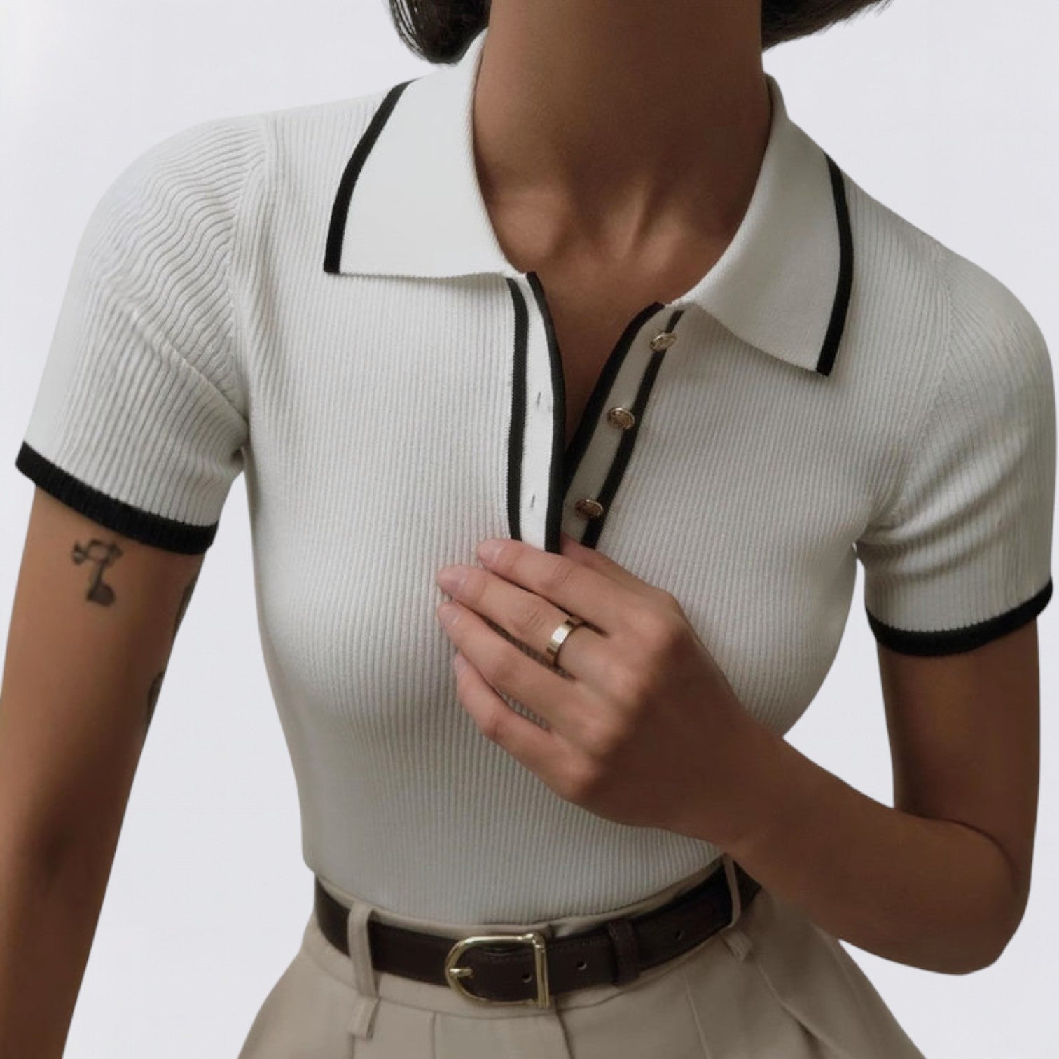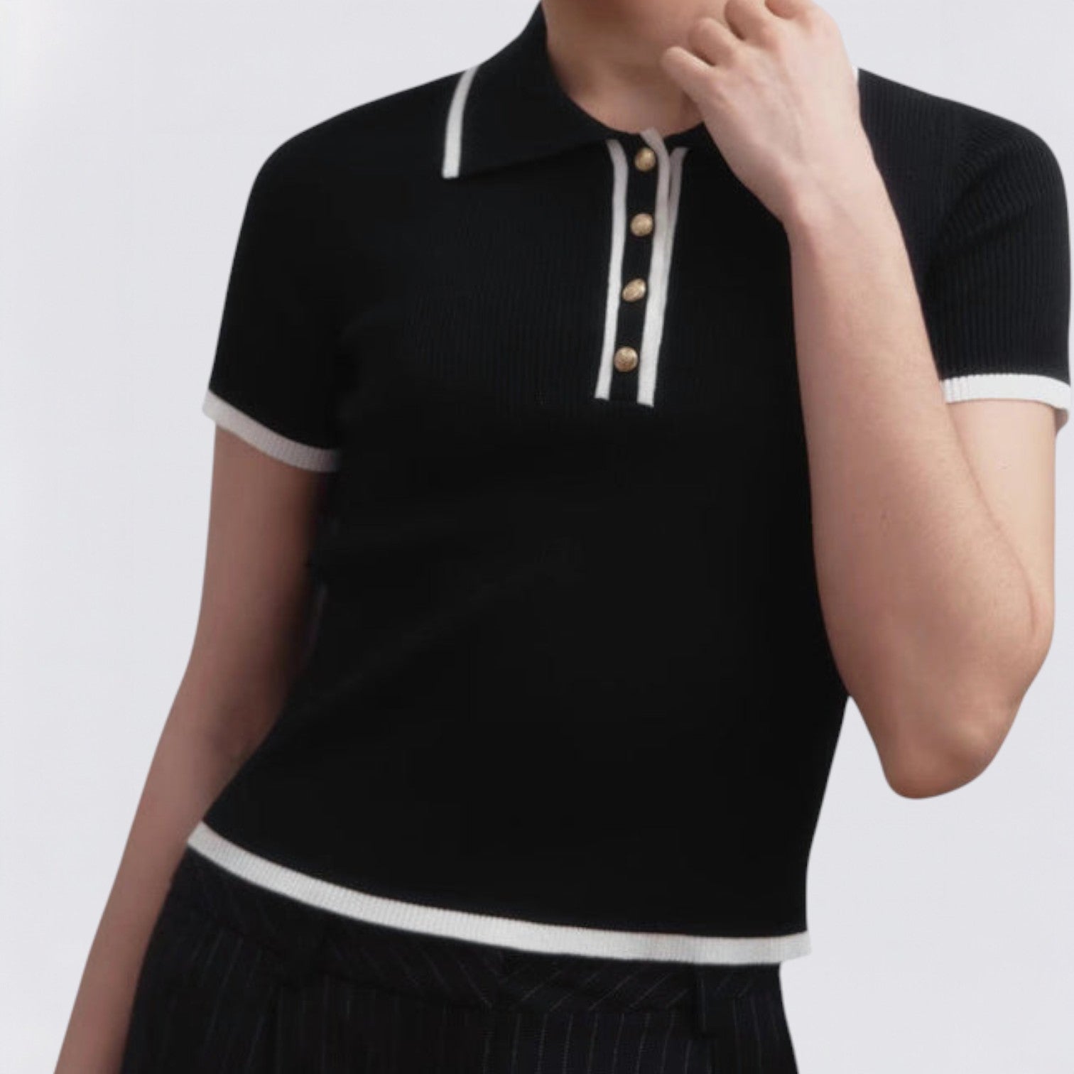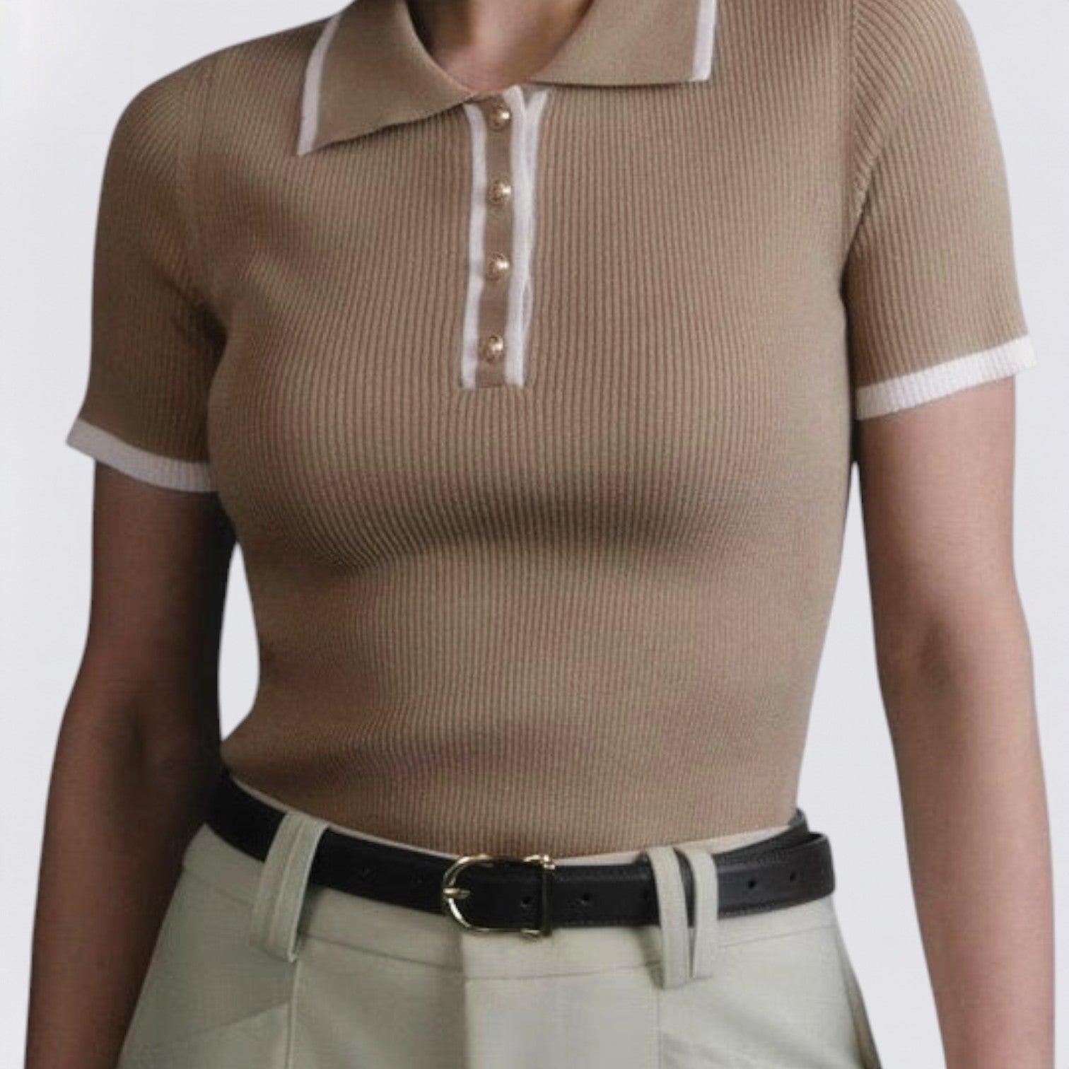 Neke modne kombinacije govore kroz detalje — Rebrasti pleteni top Valentina upravo je jedna od njih. Izrađen od fino teksturirane pletenine koja ističe figuru, savršeno spaja strukturu i mekoću. Kontrastni ovratnik dodaje dozu profinjenosti, dok zlatni gumbi nježno reflektiraju svjetlost, stvarajući suptilan, ali upečatljiv izgled.